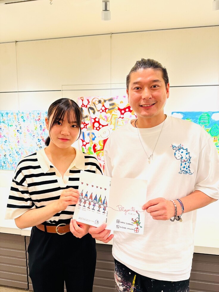 世界を繋ぐ赤い糸『わくわく、どきどき、きらきら、るんるん』をモットーに活動をされる画家の五十嵐岳さん。 理事長の古屋典子は、たまたま出かけた百貨店で開催されていた五十嵐岳さんの個展で、初めて見る彼の優しさと愛に満ちた画風に心を惹かれ、家族の絵を描いていただくようお願いをしました。
