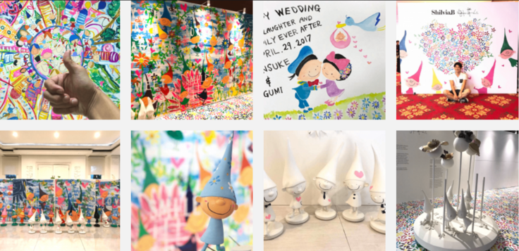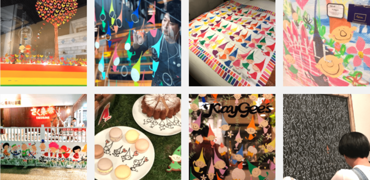 岳氏はオリジナルキャラクターの小人「ELF(エルフ)」と人間を描いた「HAPPY PEOPLE」シリーズを中心に作品を発表しています。その他、様々な企業やブランドとのコラボレーション作品も制作しており、ほのぼのとした優しく鮮やかな色使いが特徴です。彼の作品は子どもから大人まで幅広く愛されており、全国の有名デパートなどでも個展を開催されています。
