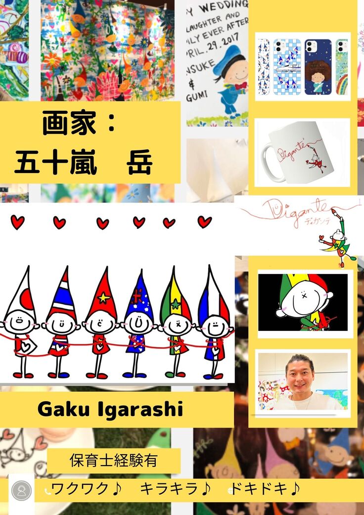 岳氏は幼少期から2010年までオーストラリアのシドニーで過ごし、チャリティーイベントやマーケットなどで絵を出展してきた経験を持っています。また在豪中に保育士の免許を取得、そのキャリアを築いてきました。日本に帰国後は幼稚園で英語教師として働きながら絵を描く日々を送っています。彼の優しく鮮やかな絵は評判になり、様々なイベントに呼ばれるようになりました。また、レストランやバーの壁画ペイント、広告のパンフレットやホームページにも作品が使われています。「ワクワク」「キラキラ」がモットーの彼の作品には愛情がいっぱい詰まっています♪