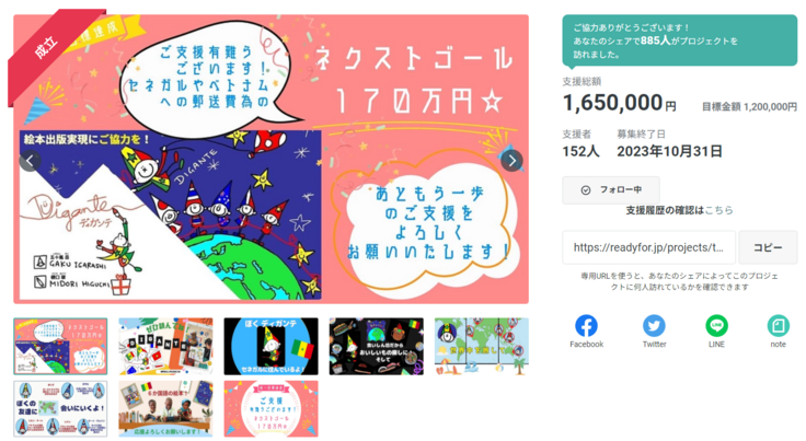 885人がサイトを見て下さり、152人の方々から合計165万円のご寄付を寄せていただくことが出来ました。