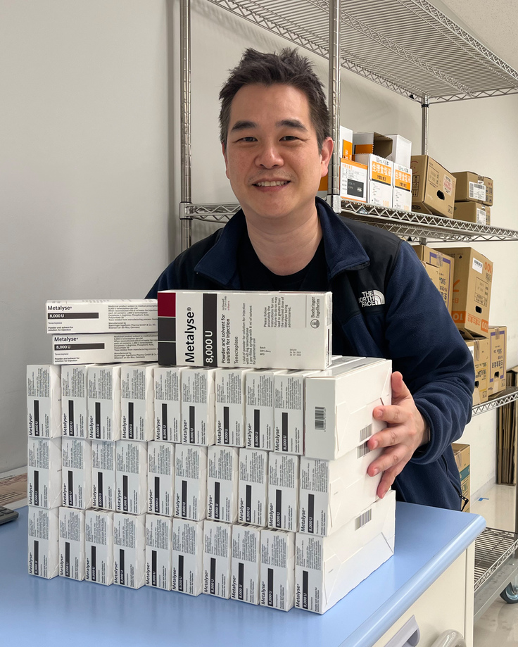その後の経過ですが、長引く円高、戦争・騒乱、好調なアメリカ経済の影響も考慮し、アメリカ製のテネクテプラーゼから欧州製のテネクテプラーゼへと購入先を変更する計画を立てました。これもひとえに、みなさまからのご支援から勇気をいただいた賜物です。おかげさまで、今回のように前例のない無謀な交渉やアクションを起こすことができました。試験途中での、試験薬のブランド変更は前例がないことであり、政府関係各所には迷惑をかけましたが、写真のとおり、本日無事にテネクテプラーゼが国立循環器病研究センターの試験事務局に到着いたしました。
