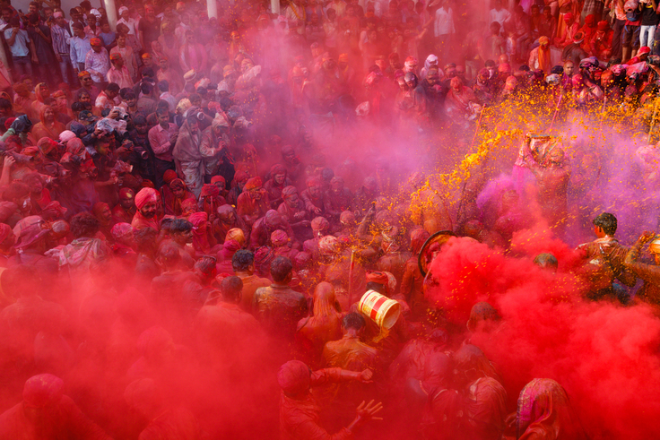 インドの春を祝う色祭りホーリー祭は毎年2月〜3月の満月の日に行われる。赤、黄、ピンクなどの色粉・色水をかけ合い、互いを祝福するヒンドゥー教のお祭りだ。祭りの期間は学校や仕事が休みとなり、都市で働いてる人々は故郷へ帰省して家族と一緒にホーリー祭を迎える文化が根強い。