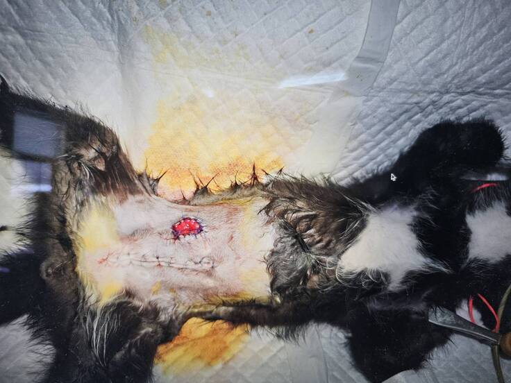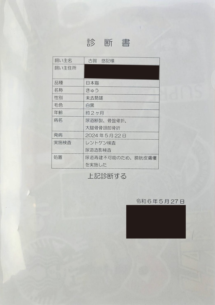 尿道が断裂し排泄ができなくなった代わりの出口を作るため開腹し、膀胱の一部ををお腹に直接露出させ穴を作りそこから尿を出せるようにするものでした。
