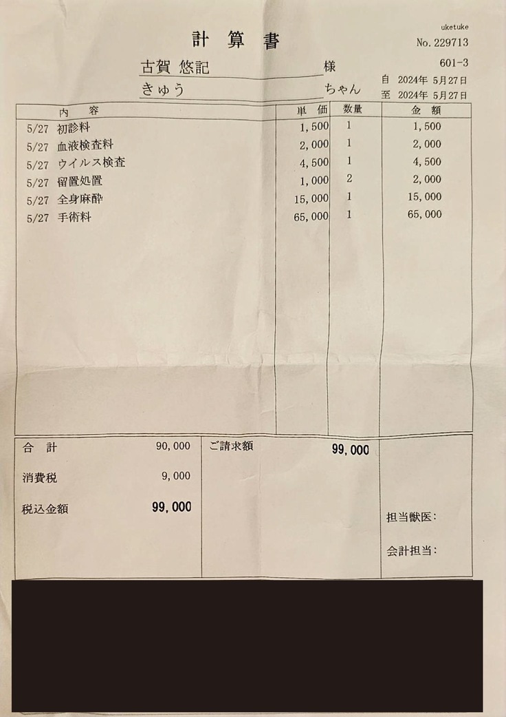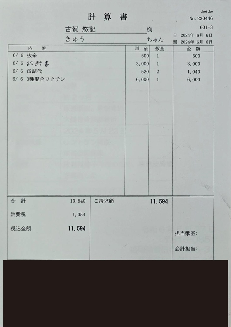 ・病院抜糸・ワクチン・診断書費用 ¥10450