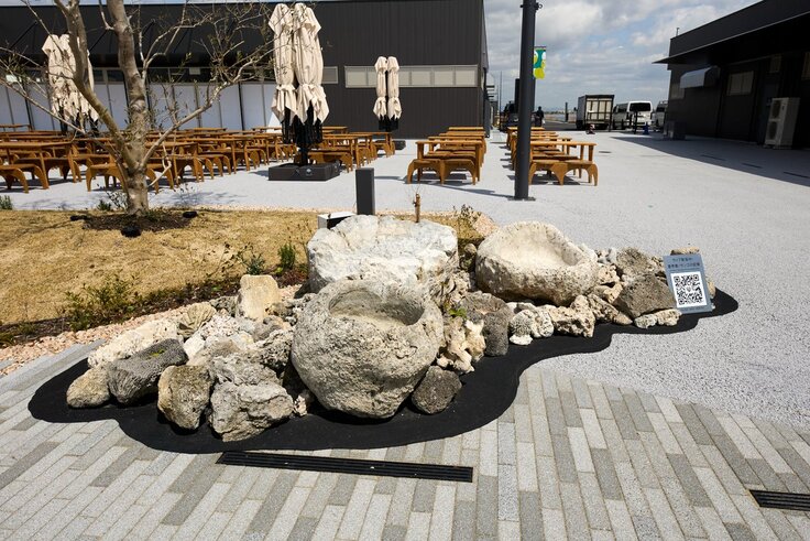 この作品は、島の全集落のみなさんが選んだサンゴ石と、3つの大きな「フムラー(トーニ)」で作った特別なインスタレーションです。