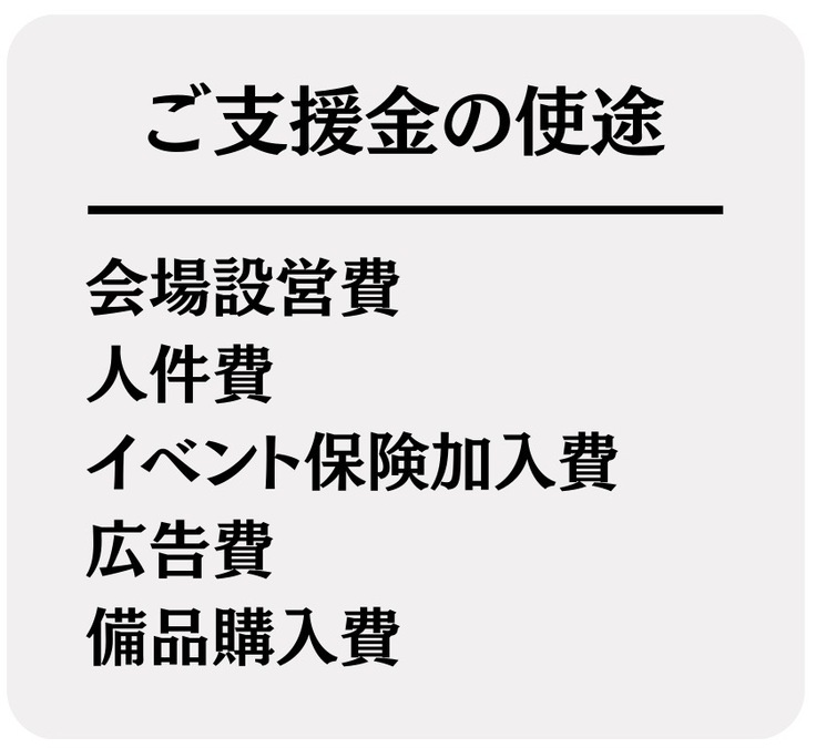 プロジェクト成立後、天災等やむを得ない事情(緊急事態宣言などコロナウイルスによる影響を含む)によりイベントが開催できなかった場合は大会実施日を延期します。