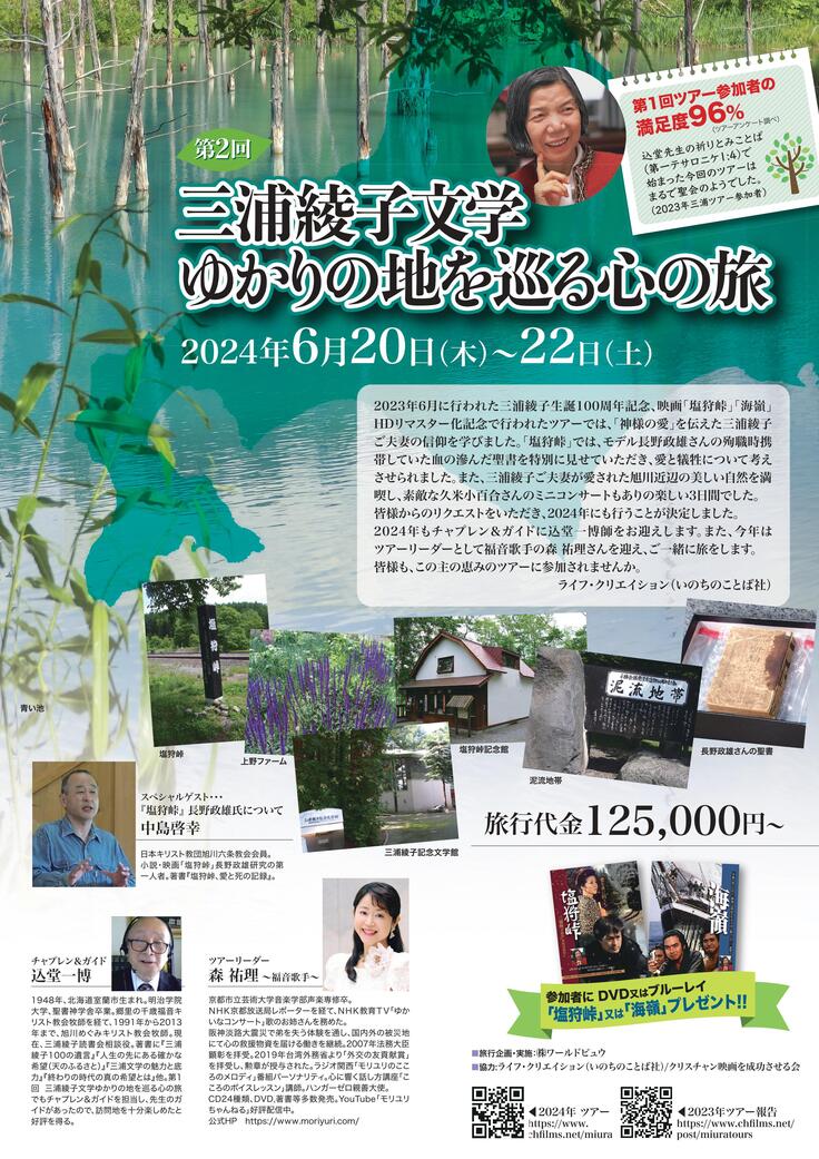 また、6月20日より、映画「塩狩峠」、「海嶺」の原作者の三浦綾子さんの世界を訪問する「三浦綾子文学 ゆかりの地を巡る心の旅」《協力ライフ・クリエイション(いのちのことば社)》が、スタッフも入れて総勢52名で行われます。