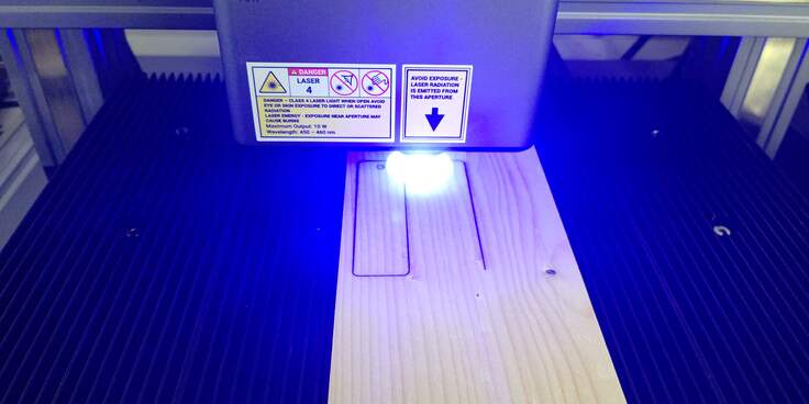 写真はリターン用の根付の木札と劇場掲示用のお名前木札用に、弊社でYouTube動画配信をしております長門と小笠原のモノづくりチャンネルogAto Factoryで使用しています3in-1 3dプリンターのレーザー加工機で木札の切り出し作業中のものです。