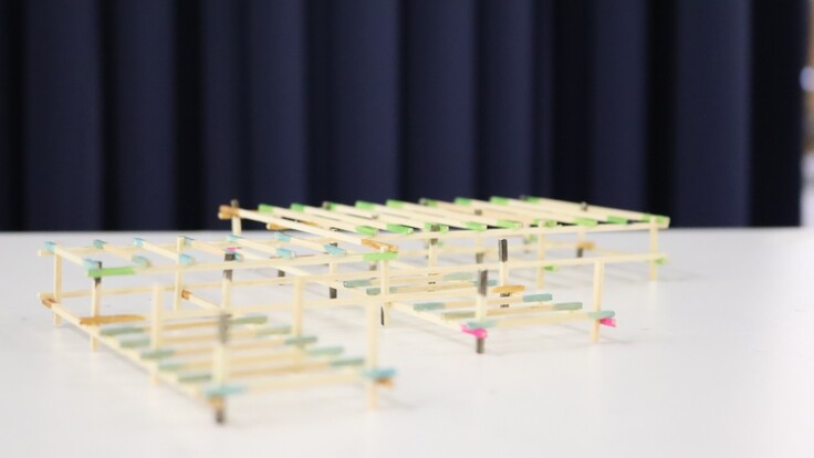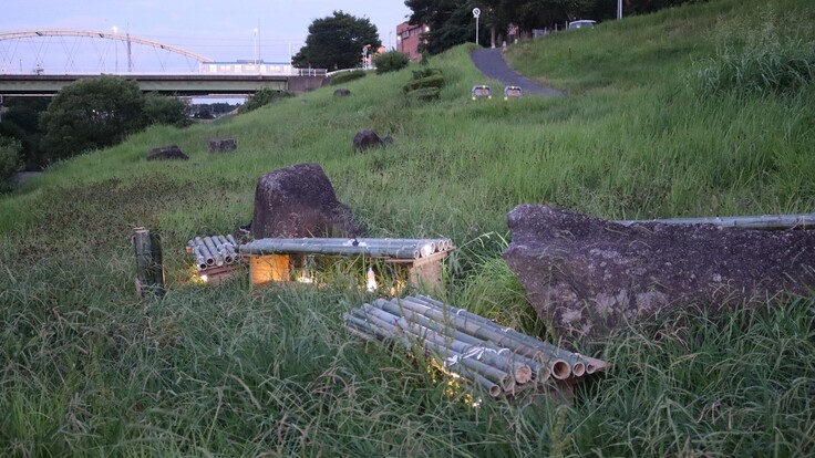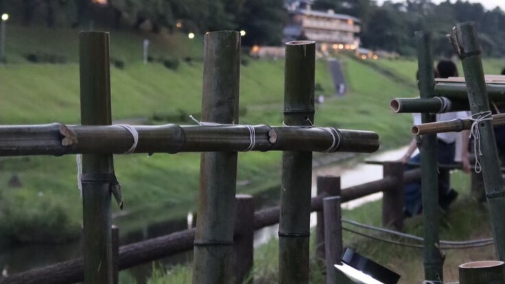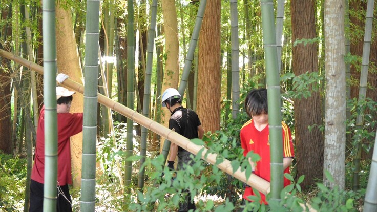 この作品はアーチ状に竹を曲げ下で竹を使って固定することで成り立っています。