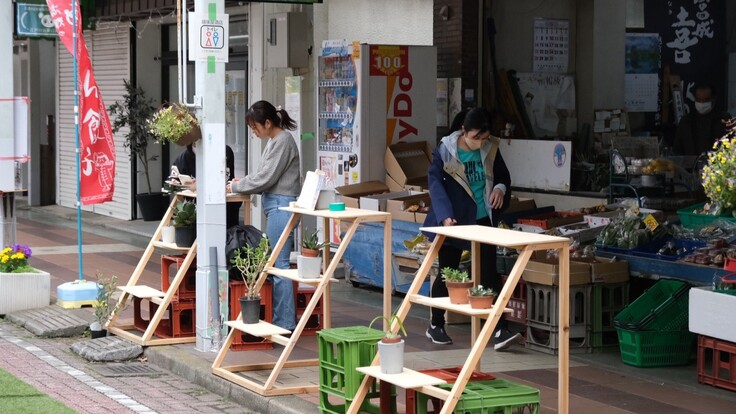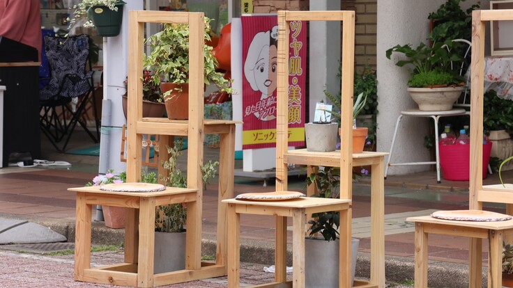 椅子とも植栽棚ともいえるこの"棚“は、薬屋さんの前に小さな子供たちのたまり場を作れないかということで始まりました。