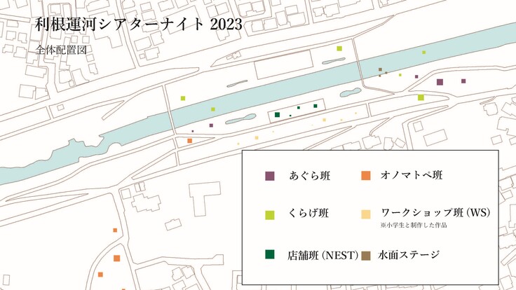 飲食店や演出者が演奏する場所に視線が集まり点として見られがちな運河をほどき、運河にステージを分布させることで運河の中心を帯として認識できるのではないかと考えています。