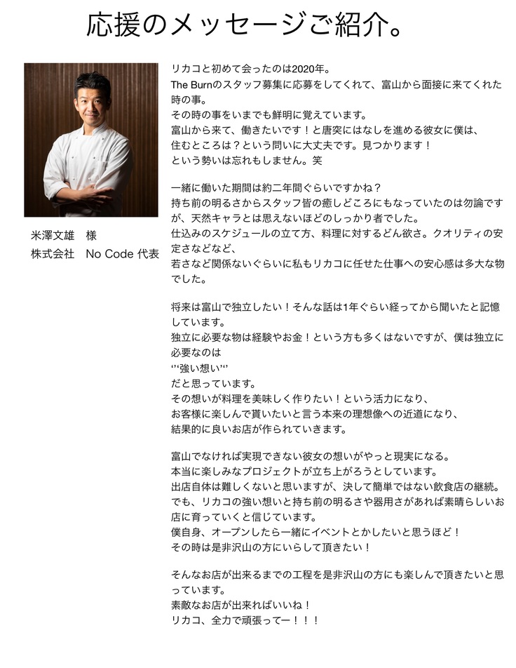 富山と日本を一度離れ、富山の良さ、日本の良さをはじめて実感しました。生まれからずっと同じ場所にいると景色や食べ物が日常化されていました。海から昇る朝日のきれいさや、新鮮でおいしい魚や野菜を食べることができること。いかに自分が恵まれているかに気づきました。 そして、せっかくの海の見える立地で、自分のできること学んできたことを生かし、応援してくださる方や支えてくれる家族の力を借りながら、お客様が癒しの時間を過ごすことができたらと思っています。お客さんも楽しめて、自分たちも楽しく働けるように精進していきたいと思います。