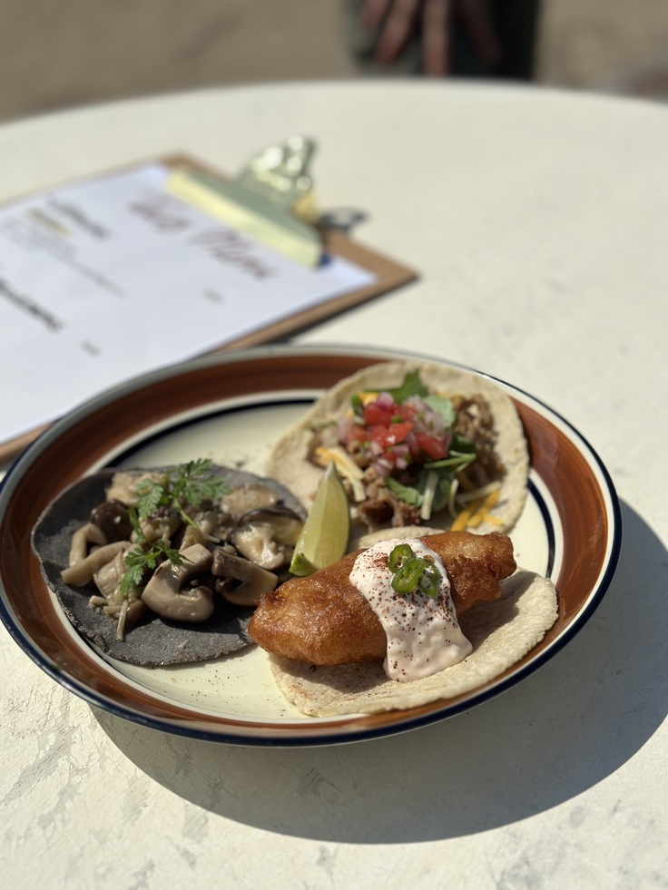 トルティーヤから手作りし、カルニタス(豚肉の煮込み)、6種のきのこガーリックソテー、鱈のフリットの3種類。