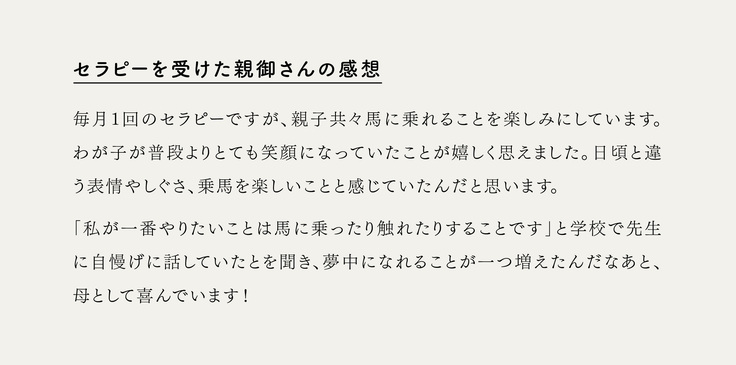 ※ホースセラピーとは馬のふれあいや乗馬をすることで身体的な機能を向上させたり、心理的に癒やされることです。ヨーロッパでは治療手段として一般的に知られています。さらに、介助者とコミュニケーションを図ることで社会性を身につける事への期待もされています。