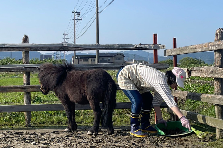 幼い頃から馬が好きで馬を飼いたいという夢があったみどりさん。2008年にご縁があり、岐阜大学からポニーのタロウを譲り受け、自宅近くに屋根と柵を設けて飼育を始めました。