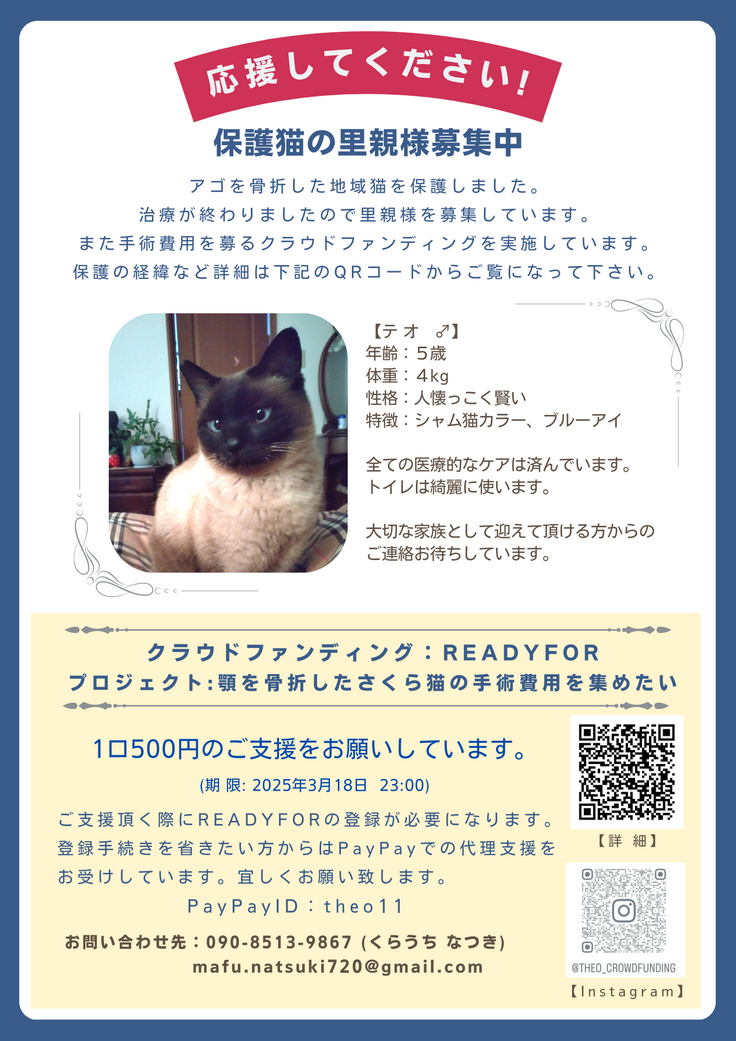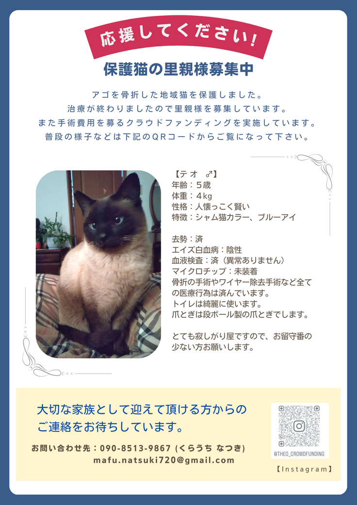 5歳の猫の里親探しは難しいと言われていましたが、テオと相性の良い方と会えそうな気がします。