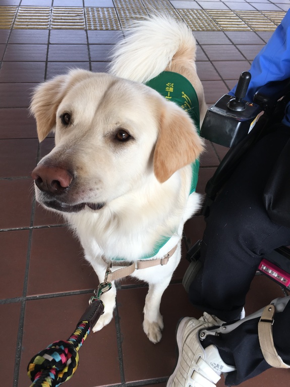 ちょっと寒い一日でしたが、白くって大きなコタロウは大人気で多くの駅に向かう人達がふれあってくれました。車いすで寄ってくださった方にもちゃんと寄り添って、しっかりお仕事をしていましたよ。