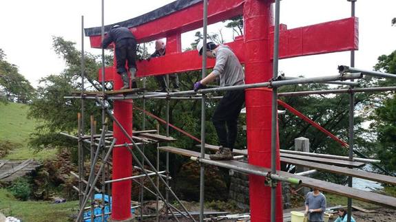 今回の作業は、表参道の赤鳥居の修復と、開運橋の補強修復作業。