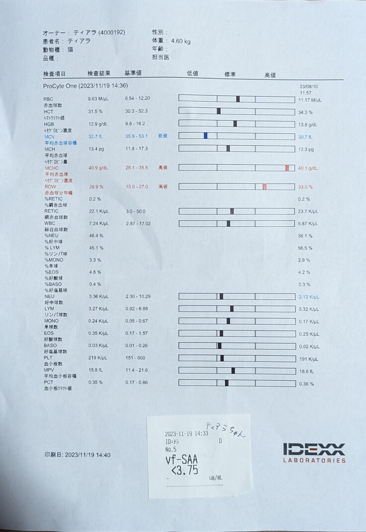 血液検査では肝臓の数値が全て基準内になり、A/G比も0.9と安心できる数値でした。