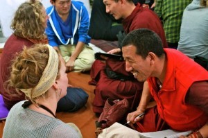 (クラスではチベット人と色々な国の人々が言葉を交わします。話題は、日常的なことから、深刻なチベットの現状まで。熱い議論が行われます。)