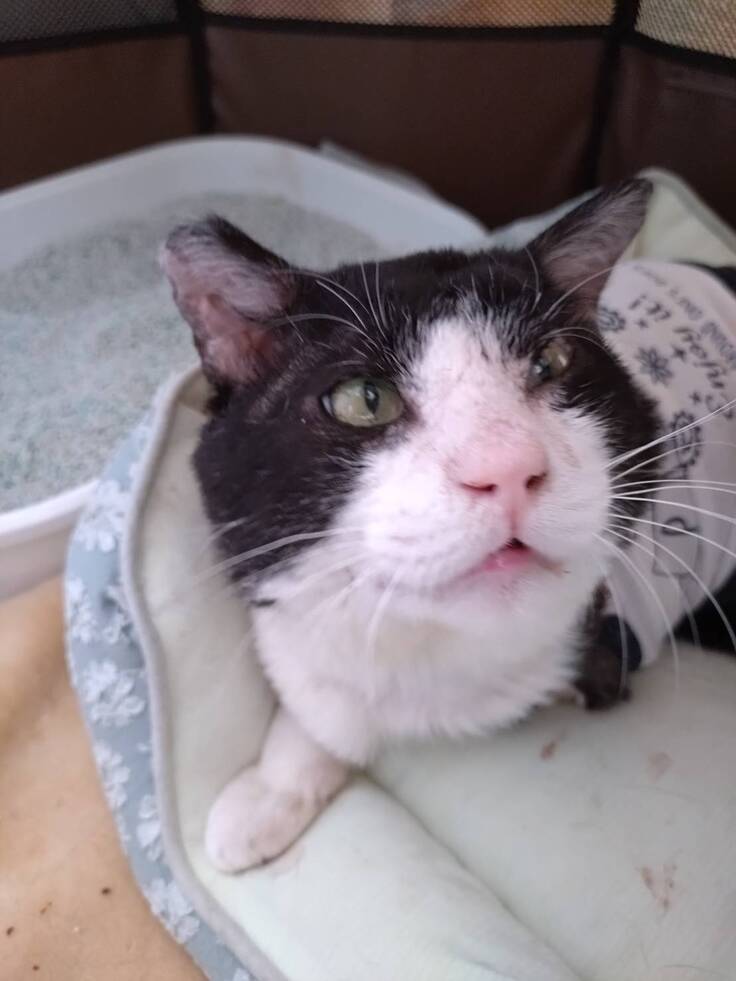 入院中も一進一退が続きましたが、動物病院さまのおかげで退院ができるまでになり、その後は保健所の職員さんの懸命なお世話で体調も安定、5月には左前足の切断手術をおこないました。