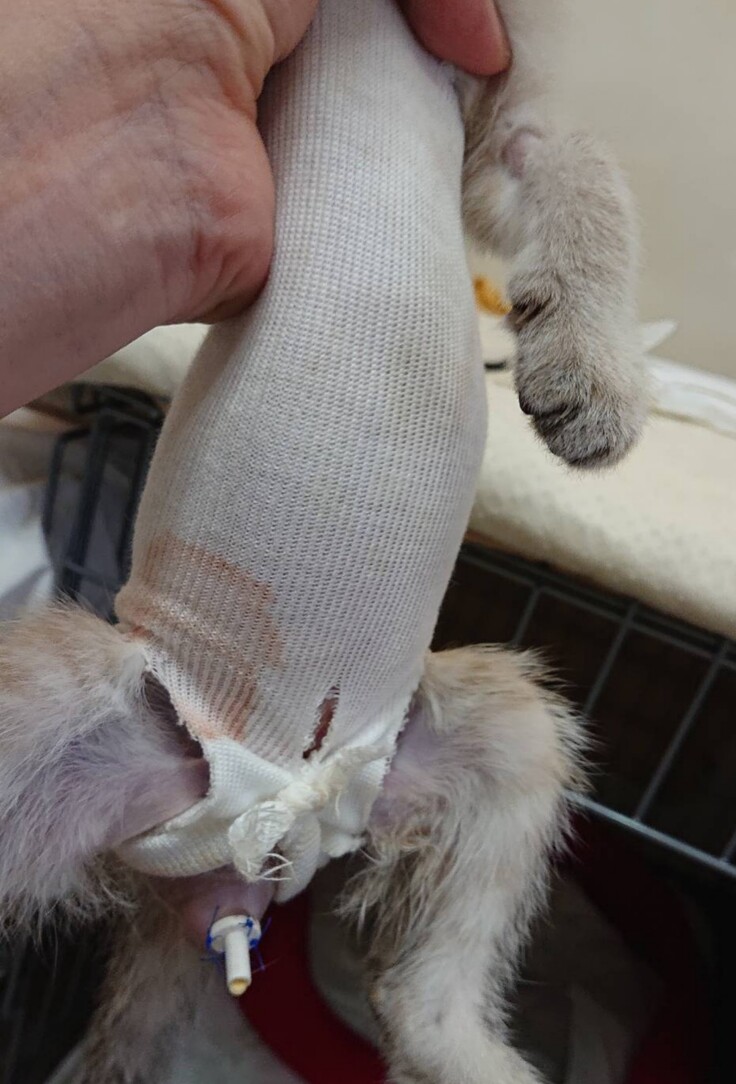 小太郎は当初、骨盤骨折と事故の衝撃による尿管損傷で、体内に尿が漏れ出している状況でした。