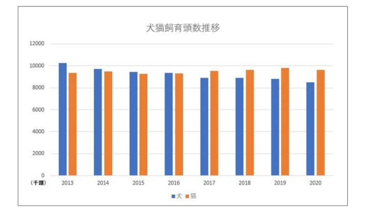 下のグラフは、日本の家庭でのペット飼育頭数の推移です。犬はやや減少傾向、猫は横ばいの傾向にあります。