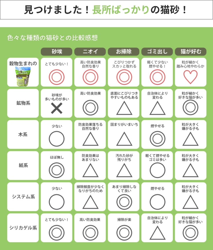 だからスマートキャットがいかに人気でその販売終了が惜しまれていたか、 そしてその実力が本物だったということを誰よりも知っています。 撤退後、類似の穀物系猫砂を使ってはみましたが、消臭力・固まり具合などやっぱりスマートキャットのほうが断然良かったな……(泣)と愛惜したものです。