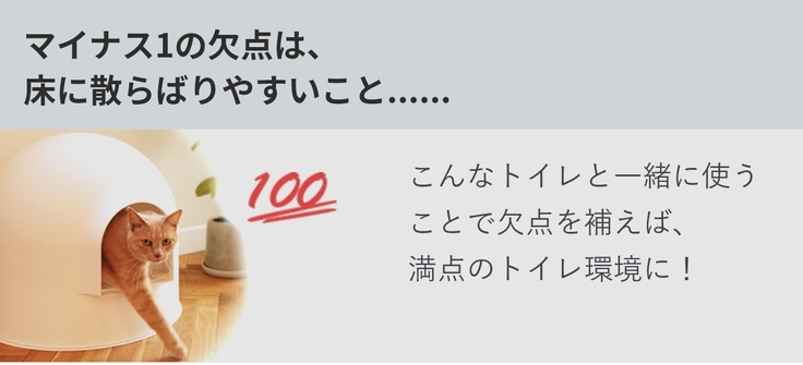 上から入るタイプの猫トイレや、足のうらについた砂を落とす、すのこ回廊がついているトイレなどを使えば、散らばりが軽減されて欠点を補います! 軽~い砂なので、ロボット掃除機は残さず吸ってくれるという利点もありますよ★