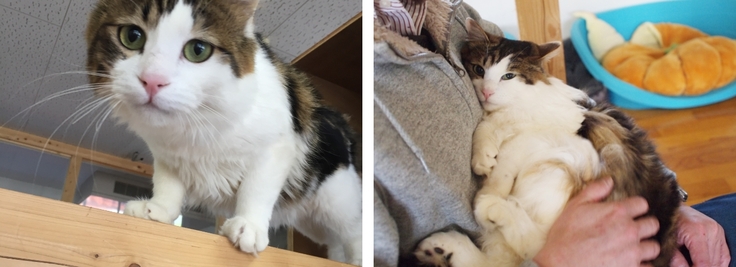 一人暮らしの飼い主さんがご高齢で認知症入院となってしまったため、入学してきました。要ダイエットのぽっちゃりさんでおまけに機嫌が悪いと攻撃力の増す困ったちゃんですが、愛嬌たっぷりで憎めないのです!