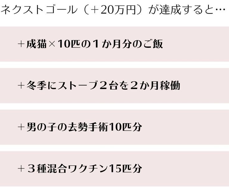 そこで、保護ねこ施設のさらなる安定運営を目指しまして、ネクストゴール+20万円を設定させて頂きました!