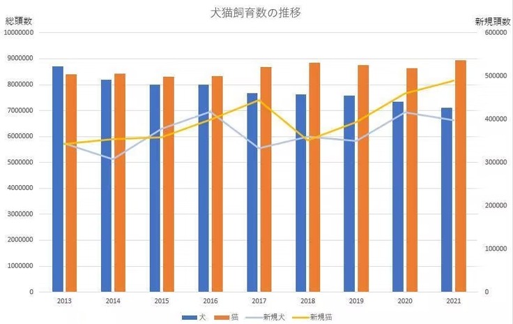 上のグラフは一般社団法人ペットフード協会「全国犬猫飼育実態調査」の数値を元にティアハイム小学校が作成したものです。犬飼いさんはやや減少、猫飼いさんはやや増加という傾向がみられます。
