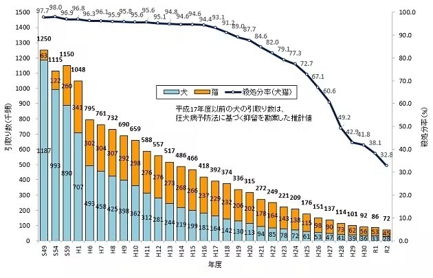 一方、保健所での引取り数は年々減っていて、殺処分数は急激な減少傾向にあります。(環境省 「犬・猫の引取り及び負傷動物等の収容並びに処分の状況」より)