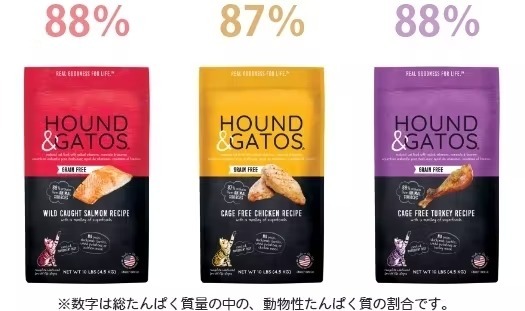 『ハウンド&ガトス』は、動物性たんぱく質87%以上・低炭水化物・グレインフリーの、猫ちゃんの健康維持に最適なキャットフードです。ウィスコンシン州を拠点とし、製品はすべてFDAとUSDAの規制に沿って品質・清潔さ・安全性を保つ、最先端の施設で生産されています。