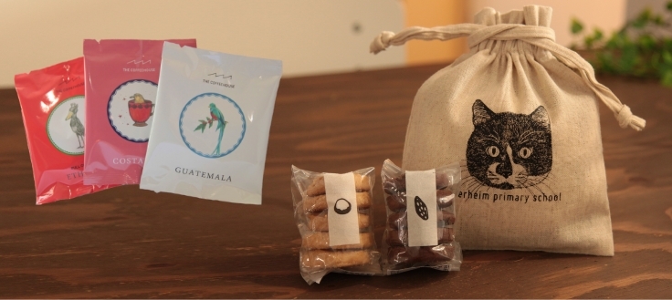 猫は飼っていないけど参加したい!という方のためにコーヒーバッグと焼き菓子、ロイ君巾着のセットもご用意しました。このような嗜好品も、継続的なご支援を見込める購買部の主力商品です。気に入っていただけたら、ぜひ購買部でリピートお願いします!