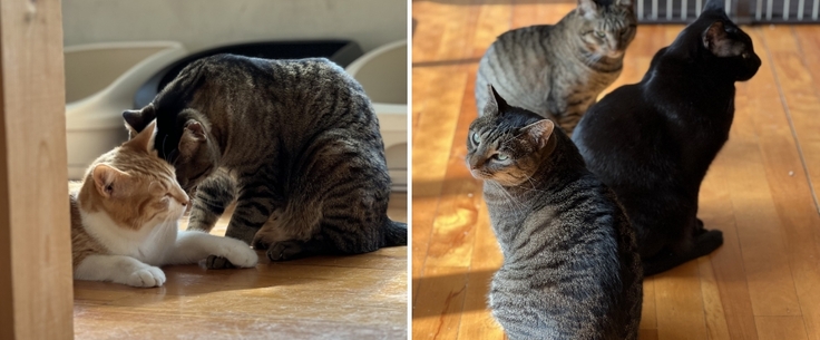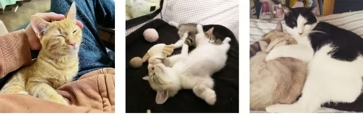 迷い猫でいたところをおばあさまに保護された月代母さんと子猫の太陽くん・星くん・月美ちゃんの親子4匹は、可愛がってくださっていたおかげでとても人懐っこく、早々にご卒業となり幸せに暮らしています。 月代母さん&月美ちゃんは母娘で一緒のご家庭に、星くん&太陽くんも仲良く一緒のご家庭にご卒業です。