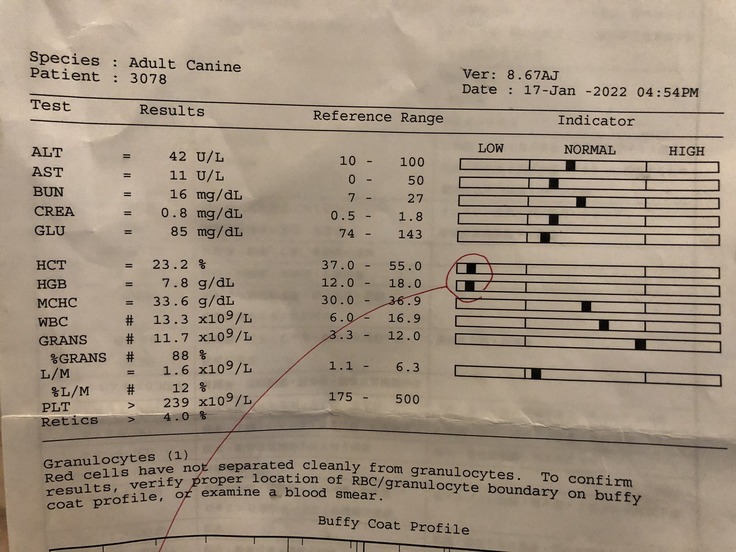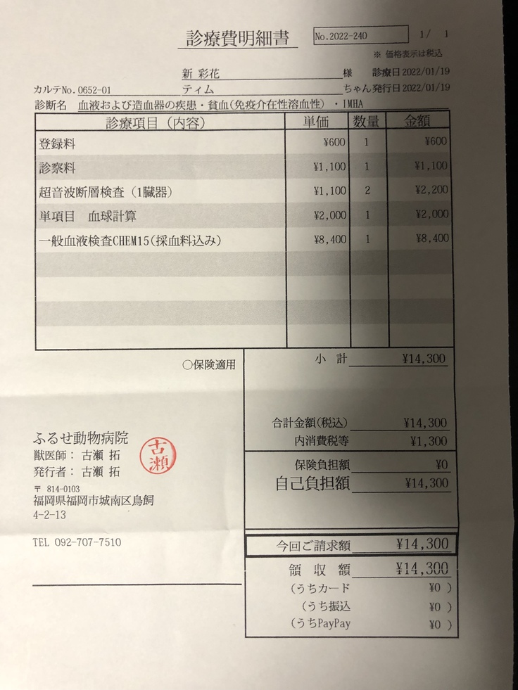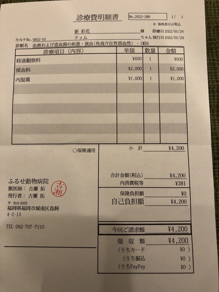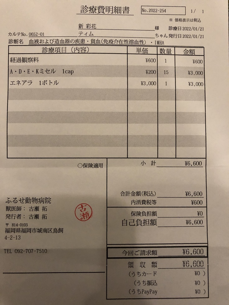 2022年1月18日:免疫介在性溶血性貧血と診断される。ステロイド剤、抗生剤の注射をしてもらう。