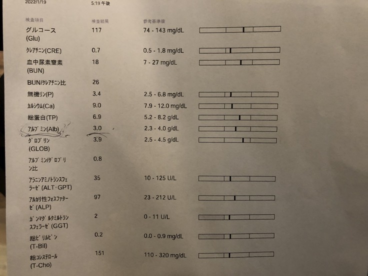 2022年1月21日:血液検査残りの結果が出る。薬のおかげもあって数値が上がってきた。