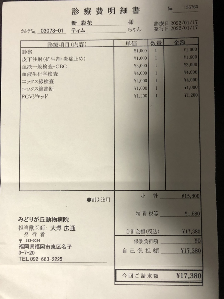 2022年1月17日:病院受診。血液検査、x線レントゲン検査を受けて、抗生剤とステロイド剤の注射をしてもらう。