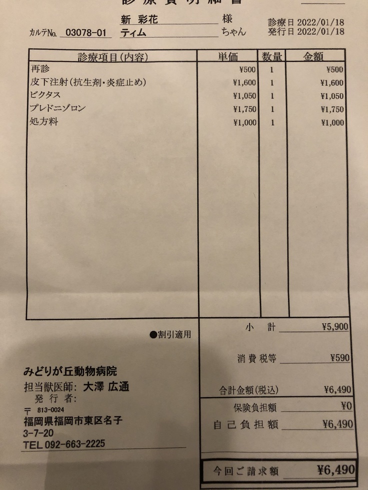仕事がお休みだったので、病院を受診しました。病院の先生がティムの身体を触って、診てくれたのですがどこも悪そうではないと言われて、ウンチの状態を聞かれたのでウンチも硬い健康なウンチだったのでそれを伝えると、悪いところはなさそうと言われました。