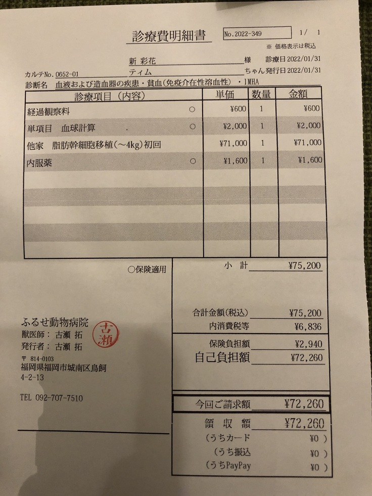 皆様の暖かい想いが詰まって集まった240,000円は大切にティムの治療費、再生医療費に使わせていただきます。