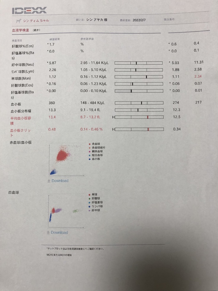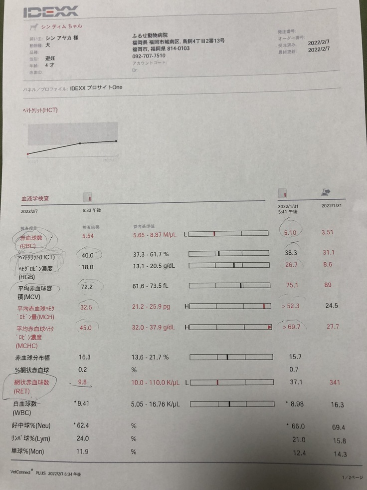 赤文字が正常ではない数値の項目です。赤血球の数値は、平均まで及びませんが、平均近くまで上がってくれていました。