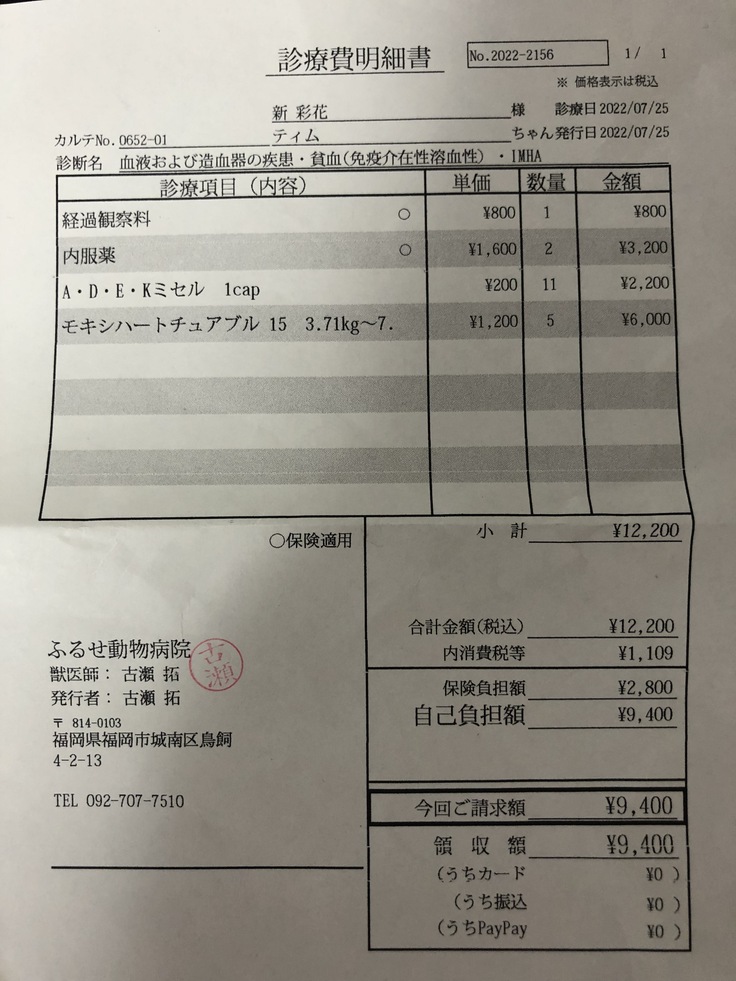 【ティムが免疫介在性溶血性貧血になってからの治療費】