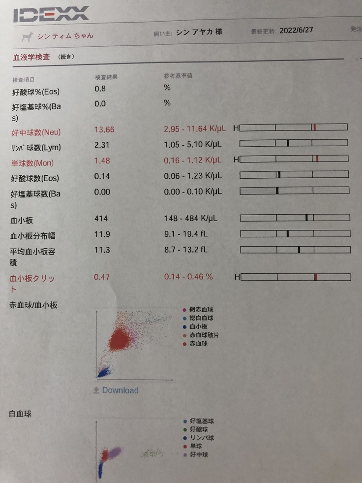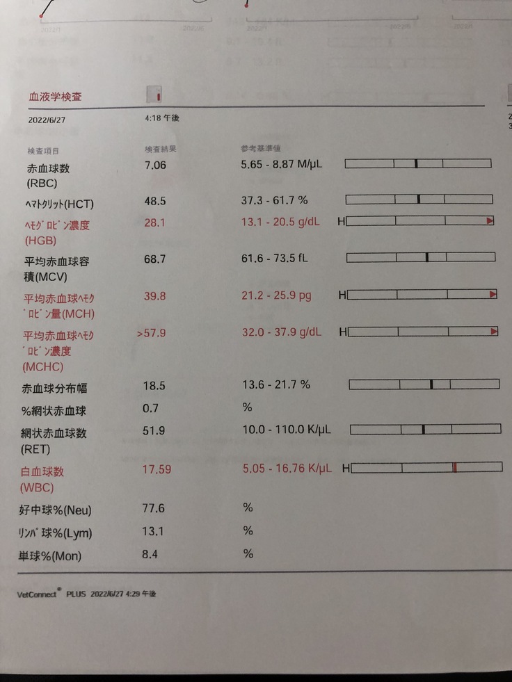 血液検査では、再生治療をしたばかりということもあって赤血球の数値が平均よりも多いという結果が出ました。基準値よりも上回っていますが問題はなく、日にちが経てば落ち着いてくるだろうとのことでした。