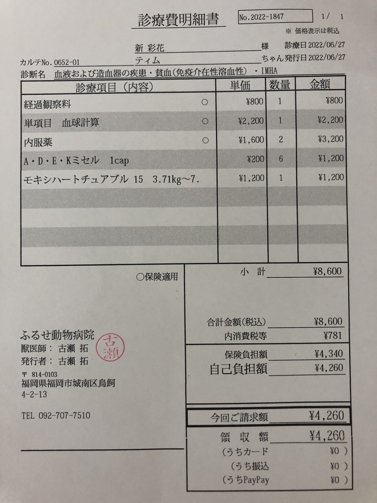 この日は、6月20日に再生治療をしたのでその経過を見るための通院でした。モキシハートチュアブルはフィラリアのお薬なので金額から差し引いています。