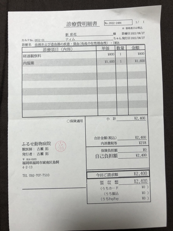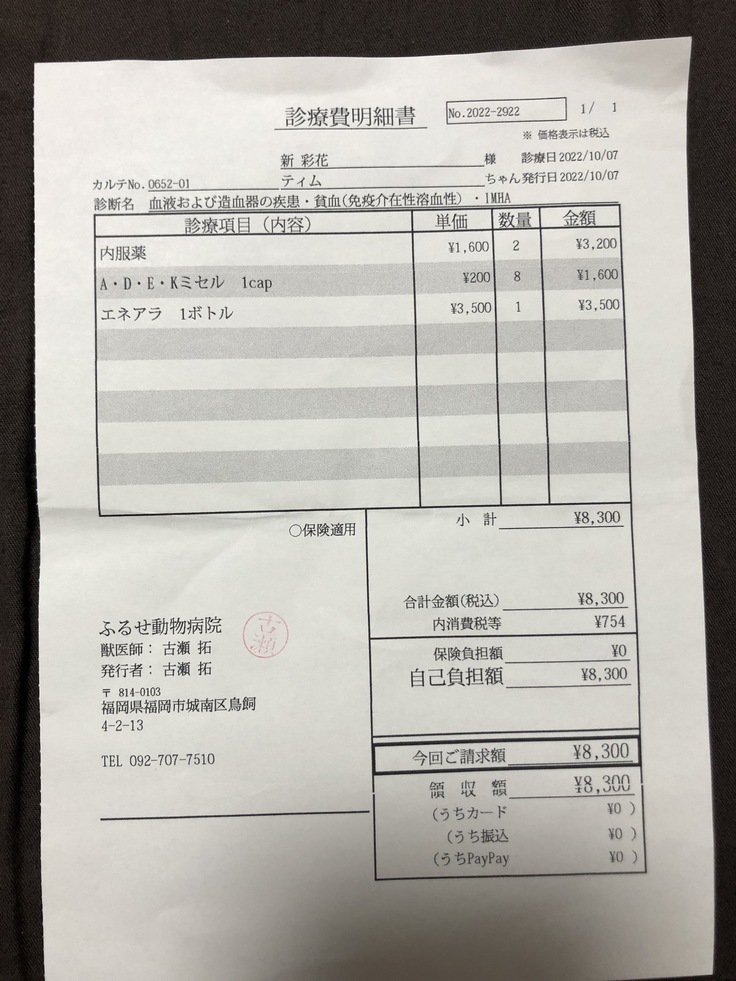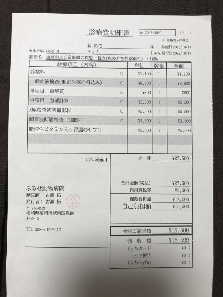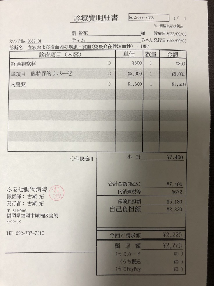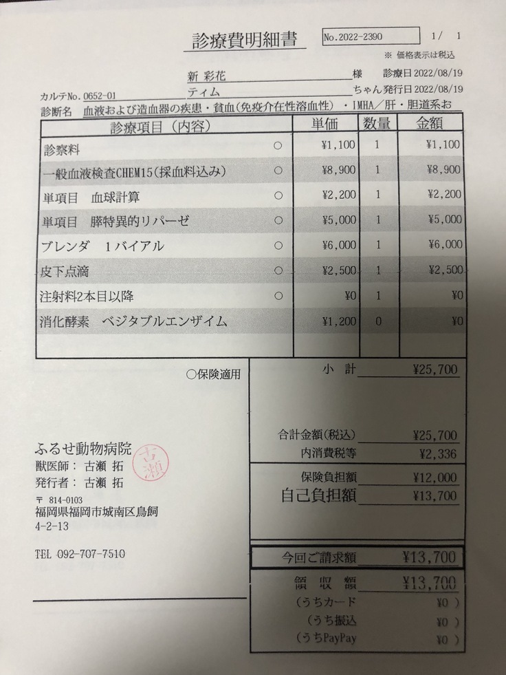 【ティムが免疫介在性溶血性貧血になってからの治療費】