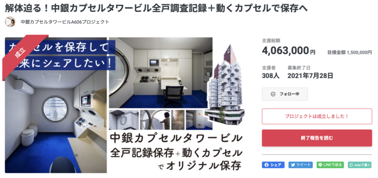 私たちは2021年7月末まで「解体迫る!中銀カプセルタワービル全戸調査記録+動くカプセルで 保存へ」というクラウドファンディングでご支援を募りました。