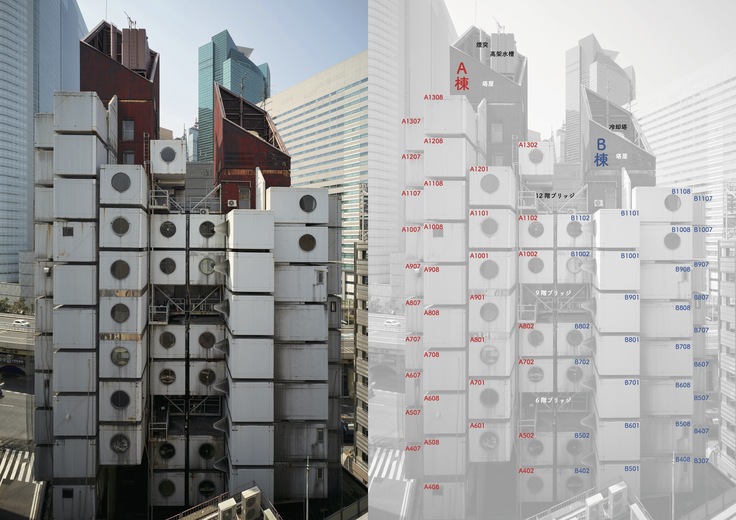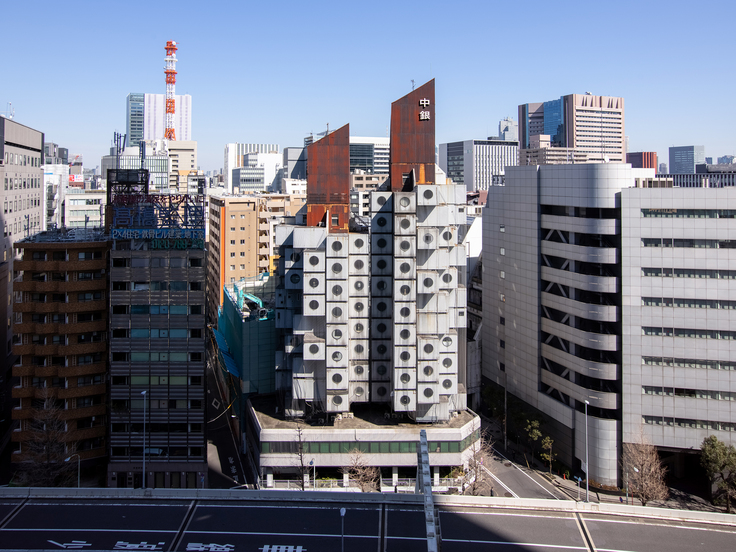中銀(なかぎん)カプセルタワービルは1972年に竣工し、黒川紀章氏が設計した直方体の部屋に大きな丸窓がある「カプセルユニット」が特徴的な建築です。140個のカプセルがある分譲マンションで、2階は建築主の中銀グループの本社、1階には店舗がありました。