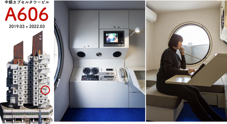 中銀カプセルタワービルA606プロジェクト、代表いしまるあきこ(石丸彰子)です。2013年から1年ほど中銀カプセルタワービルに住み、その後からオフィスとして使い続けてきました。2017年からA606をシェアオフィスとして企画・運営しながら、1972年の竣工時にレストアして、複数の会員とともに使用してきました。(2021年8月末終了)2022年4月から中銀カプセルタワービルの解体が始まっています。私たちは、全140個のカプセルと全館の全戸調査を行い図面・写真をまとめた中銀カプセルタワービル全戸図録「カプセル1972−2022」を制作し、アスベスト対策をした上での複数カプセルのオリジナルパーツの救出を行いました。カプセルA606などを救出し、多くの方と「シェア保存」していきます。