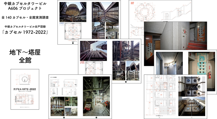 大学の先生や建築家の方々にも協力してもらい、解体工事直前まで私たちは全館の実測調査を行いました。全140カプセルと共用部(1階ホール、階段室、EV、EV機械室、ブリッジ、地下室、塔屋、3階屋上、2階本社、1階店舗、1階防災センターなど)の実測調査です。